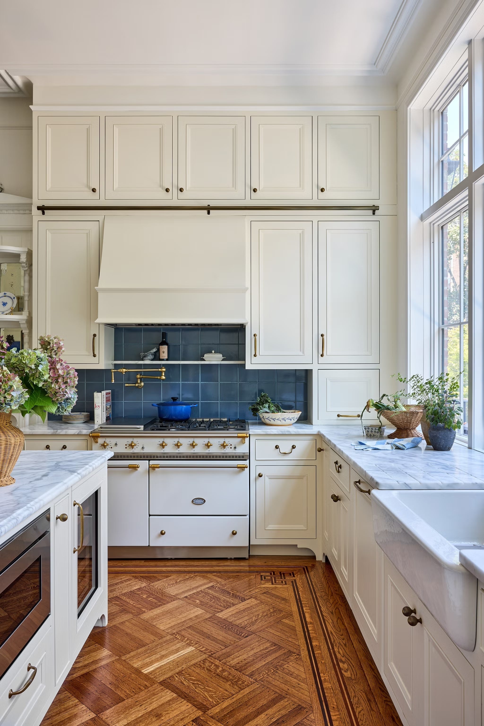 New cabinetry combines with restored details, like historic moldings and a pier mirror.