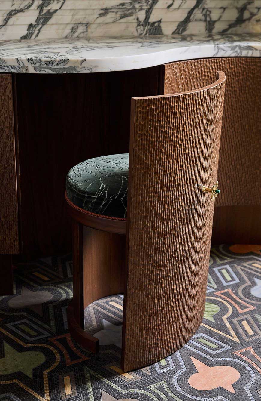 She installed luxurious materials that include- Artistic Tile, Acra marble slab, a bathtub by Kohler, Modern Matter hardware and Holland & Sherry fabrics.