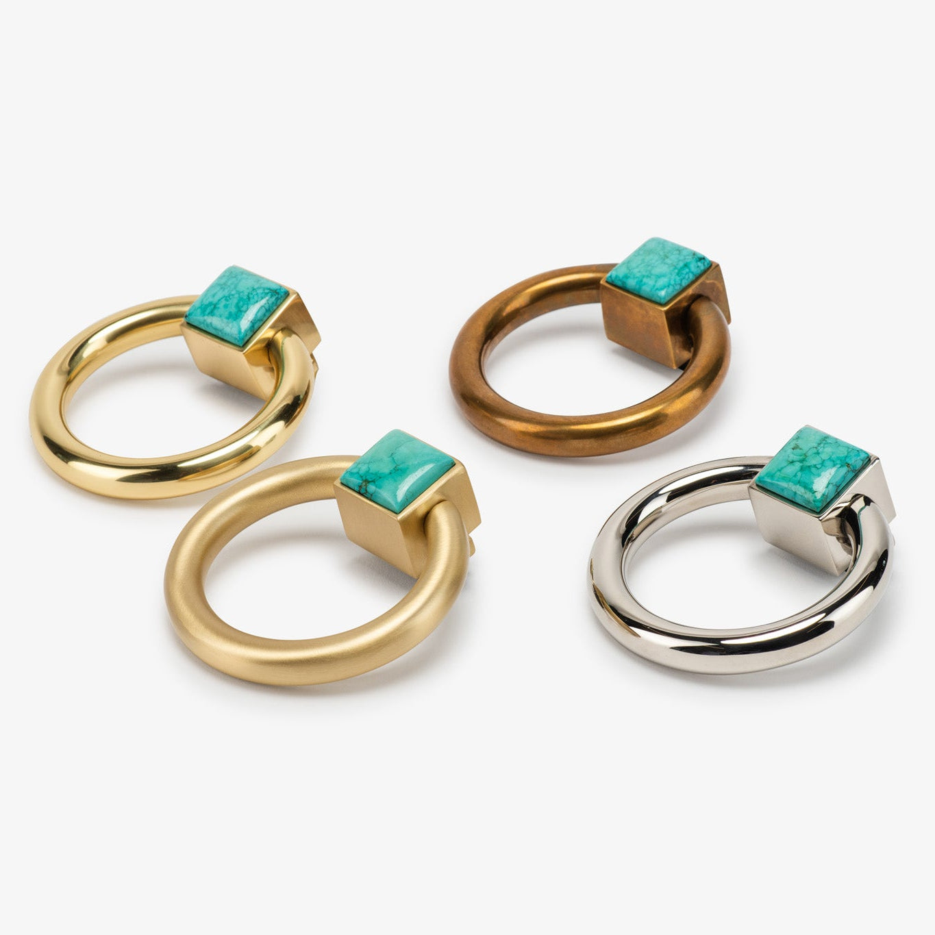 The Porter Ring Pull is our take on the classic ring pull design. The solid brass ring weaves through a square center, which is embellished with a colored semi-precious stone or resin. This timeless design is featured in our collaboration with the luxury furniture brand Kravet in their iCreate line.