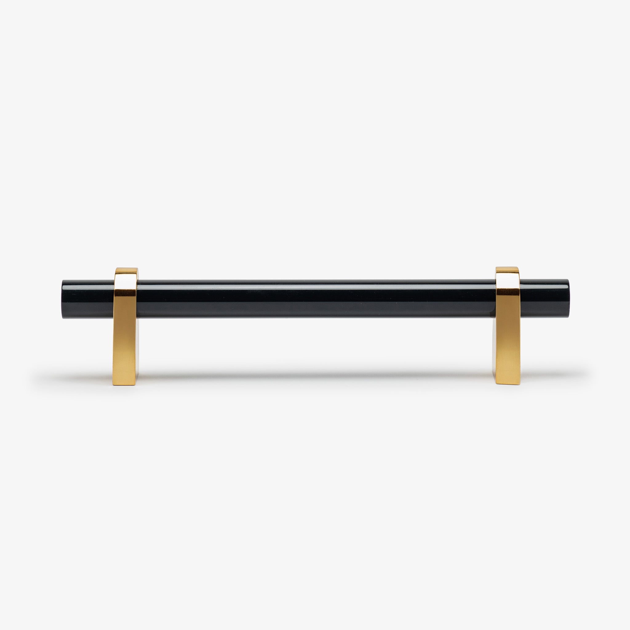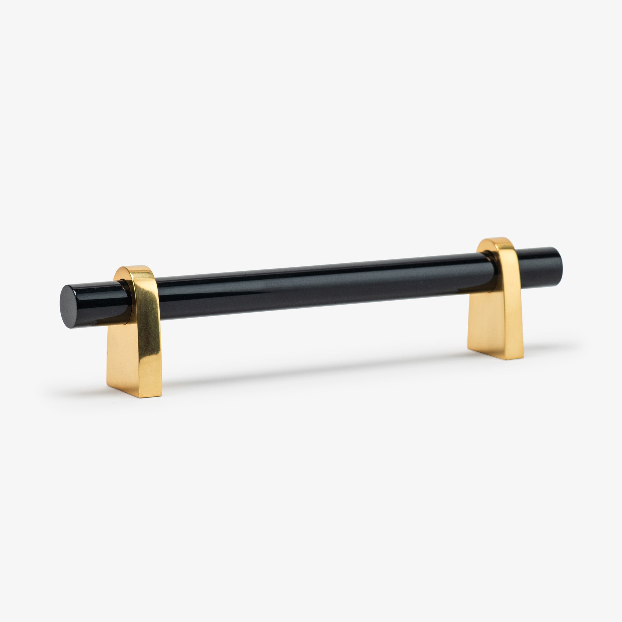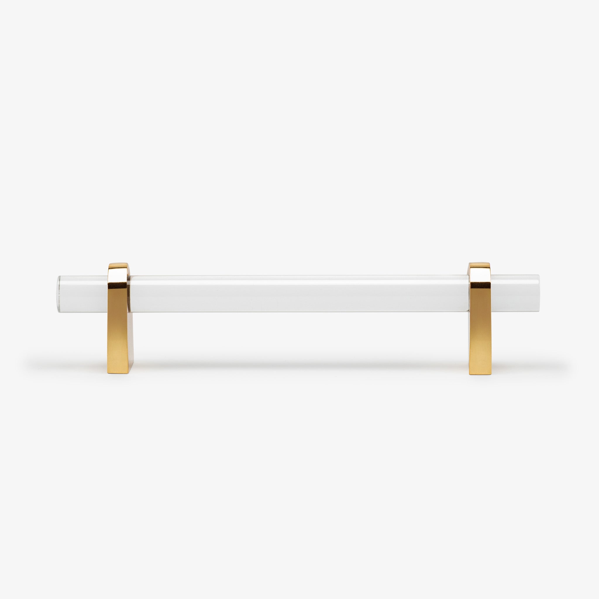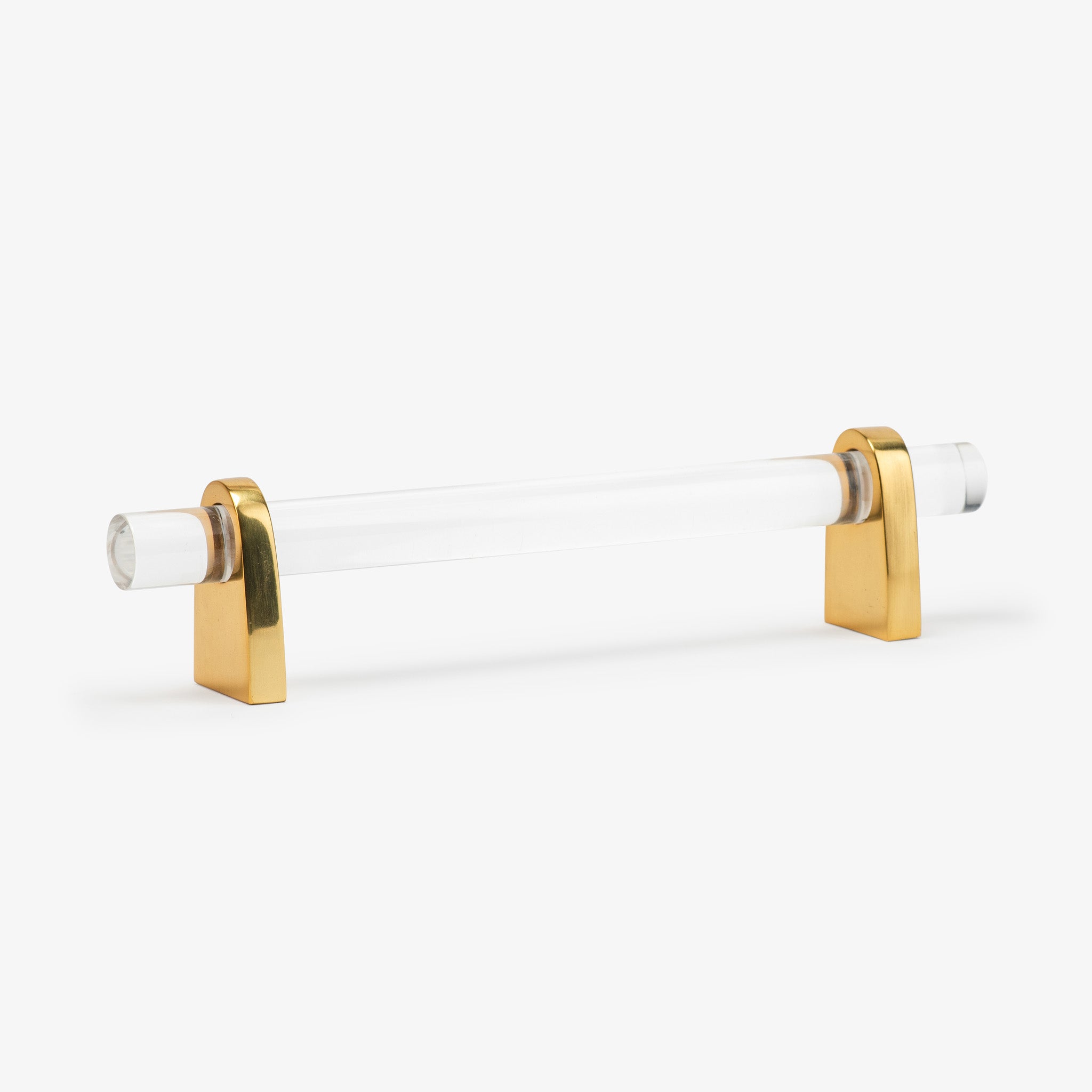 This modern pull mixes a polished brass frame with clear and colored round acrylic rods. Use this pull to make a sleek statement or to bring a pop of color in your home. This design can be used horizontally and vertically on dressers, bars, cabinets, and drawers.