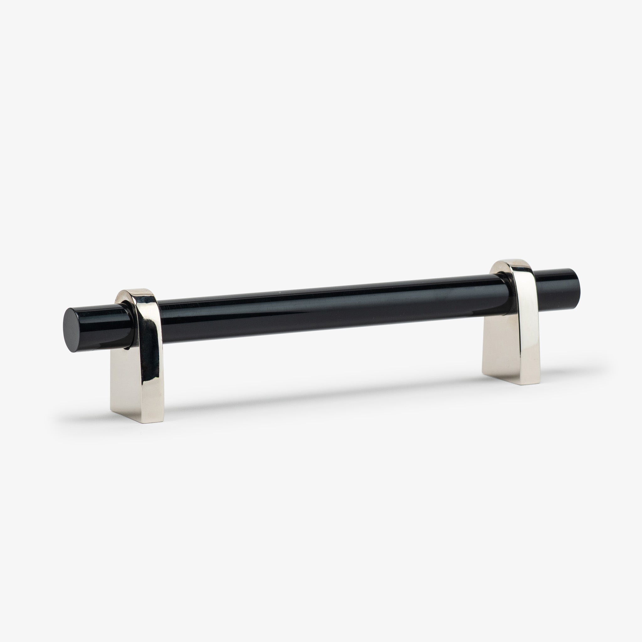 This modern pull mixes a polished brass frame with clear and colored round acrylic rods. Use this pull to make a sleek statement or to bring a pop of color in your home. This design can be used horizontally and vertically on dressers, bars, cabinets, and drawers.